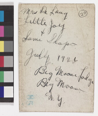 u.l. to l.r. in graphite and black ink: Mrs. De Lang \ Little Joy \ + \ Jane Shape \ July 1926 \ Big Moose Lodge \ Big Moose \ N.Y.
