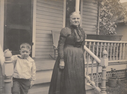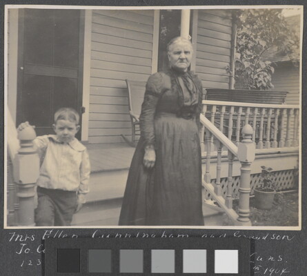 l.l. to l.r. in ink: Mrs. Ellen Cunningham and Grandson \ Jo. Cunningham \ 123 S. Steuben Ave. Chanute Kans. \ Photo June 10th 1904