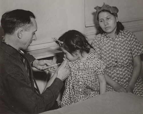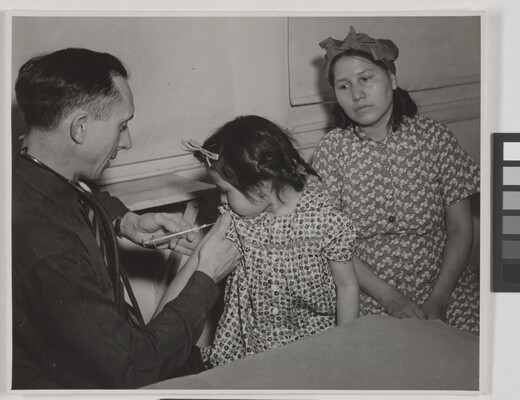 c. in black ink: Mrs. Red Bear watches \ while gov't doctor immunizes her little girl.