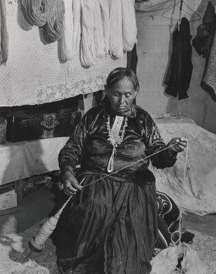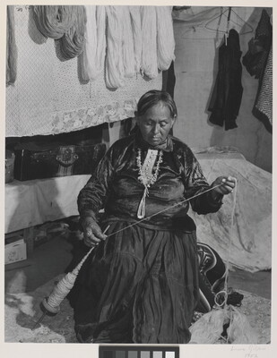 u.c. on paper label: [printed]: A PHOTOGRAPH BY \ LAURA GILPIN \SANTA FE, NEW MEXICO \ [typed]: MRS. SIX SPINNING 1952 \ From THE ENDURING NAVAHO \ University of Texas Press 1968