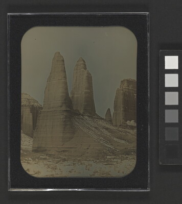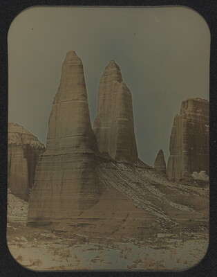 u.l. to u.r. titled, dated, and signed, [etched]: "Natural Obelisks" \ Cathedral Valley, Capitol \ Reef National Park, UT \ Jan. 28, 1996 \ © R. Shlaer 624