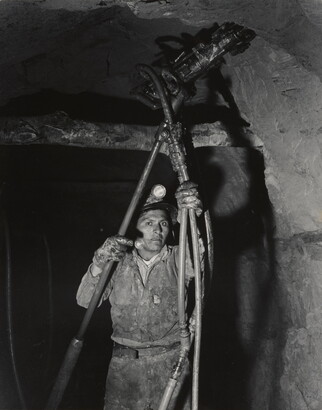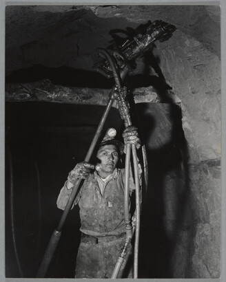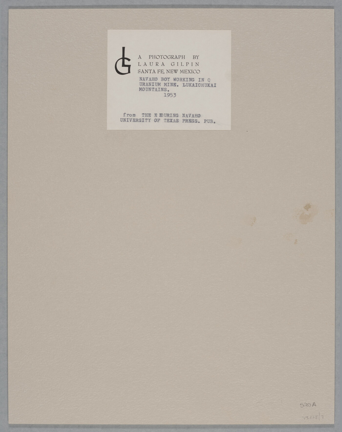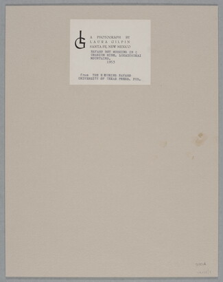 u.c. to c. printed on label: A PHOTOGRAPH BY \ LAURA GILPIN \ SANTA FE, NEW MEXICO [typed]: NAVAHO BOY WORKING IN Q [sic] \ URANIUM MINE. LUKAICHUKAI \ MOUNTAINS. \ 1953 \ from THE ENDURING NAVAHO \ UNIVERSITY OF TEXAS PRESS. PUB. 1968