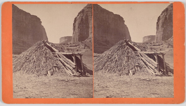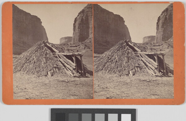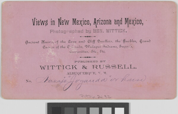 c. printed: Views in New Mexico, Arizona and Mexico, \ Photographed by BEN. WITTICK. \ Ancient Ruins of the Cave and Cliff Dwellers, the Pueblos, Grand \ Canon of the Colorado, Walapai Indians, Supai's, \ Curiosities, Etc.Etc.\ WITTICK & RUSSELL, \ ALBUQUERQUE, N.M. \ No. [in ink]: Navajo "Jogauda" or house