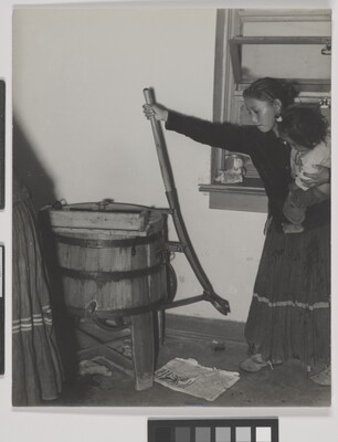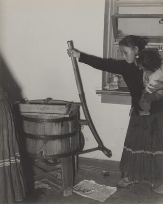 [Navajo woman holding infant while washing clothes]