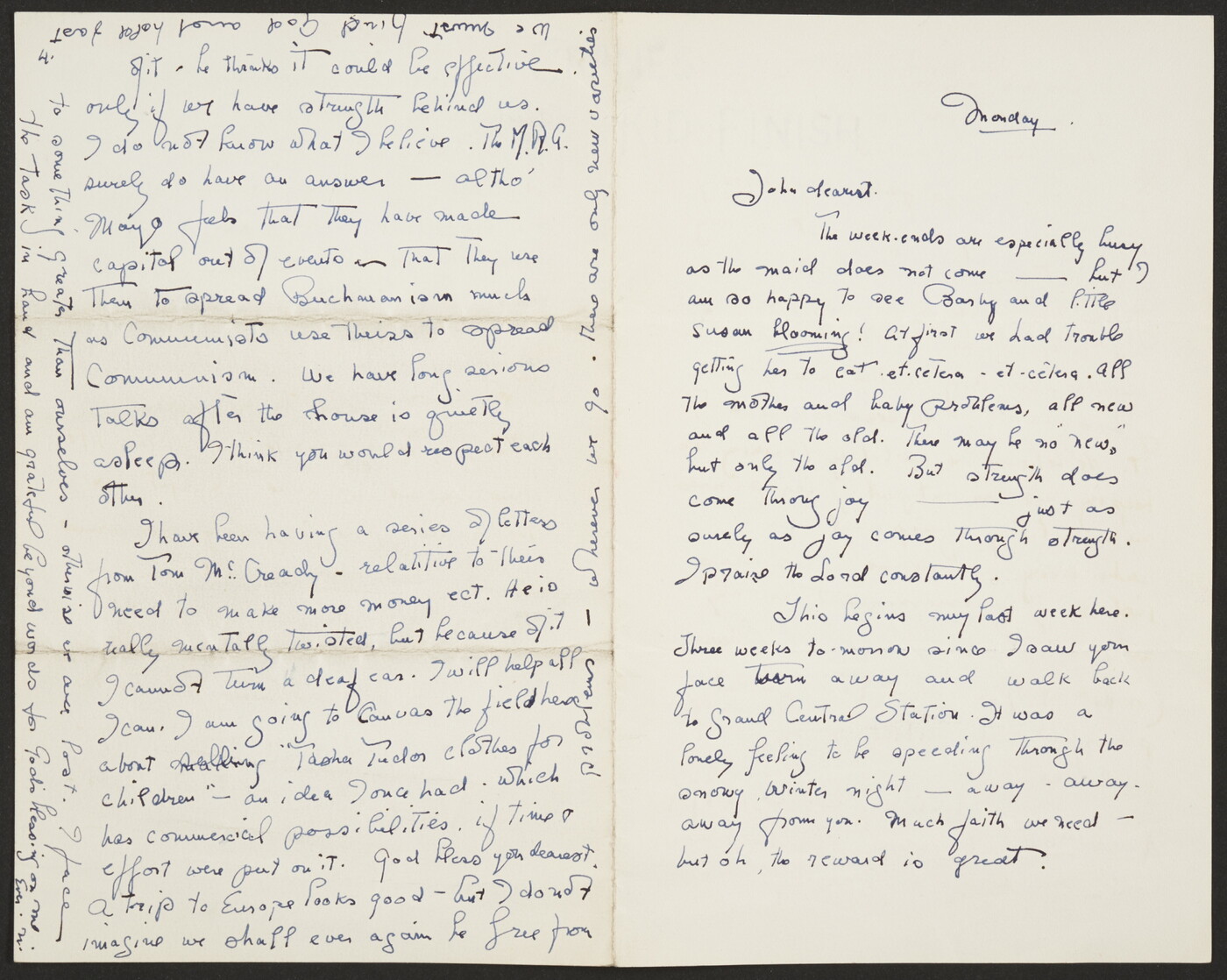 Autograph letter signed. Dorr is staying with her daughter, Barbara after the birth of Dorr’s granddaughter Susan. She mentions talks in the evenings with Mayo [Tenery], her son-in-law, in which they discuss world affairs and his belief in the necessity of a stronger American military. She is going to look into the feasibility of selling a line of Tasha Tudor clothes for children to help Tom McCready who she says is “mentally twisted” [He is Nell’s friend Tasha Tudor’s husband.]