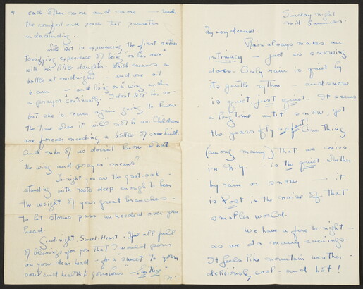 Autograph letter signed. Says they miss the quiet in New York when the rain or snow falls. Tasha [Tudor] and her “brood” came to tea. Tells John she sees more clearly where their strengths and weaknesses lie and says some thsy can change and some they must avoid. Says Bet is experiencing the first experience of being alone with her new little daughter.