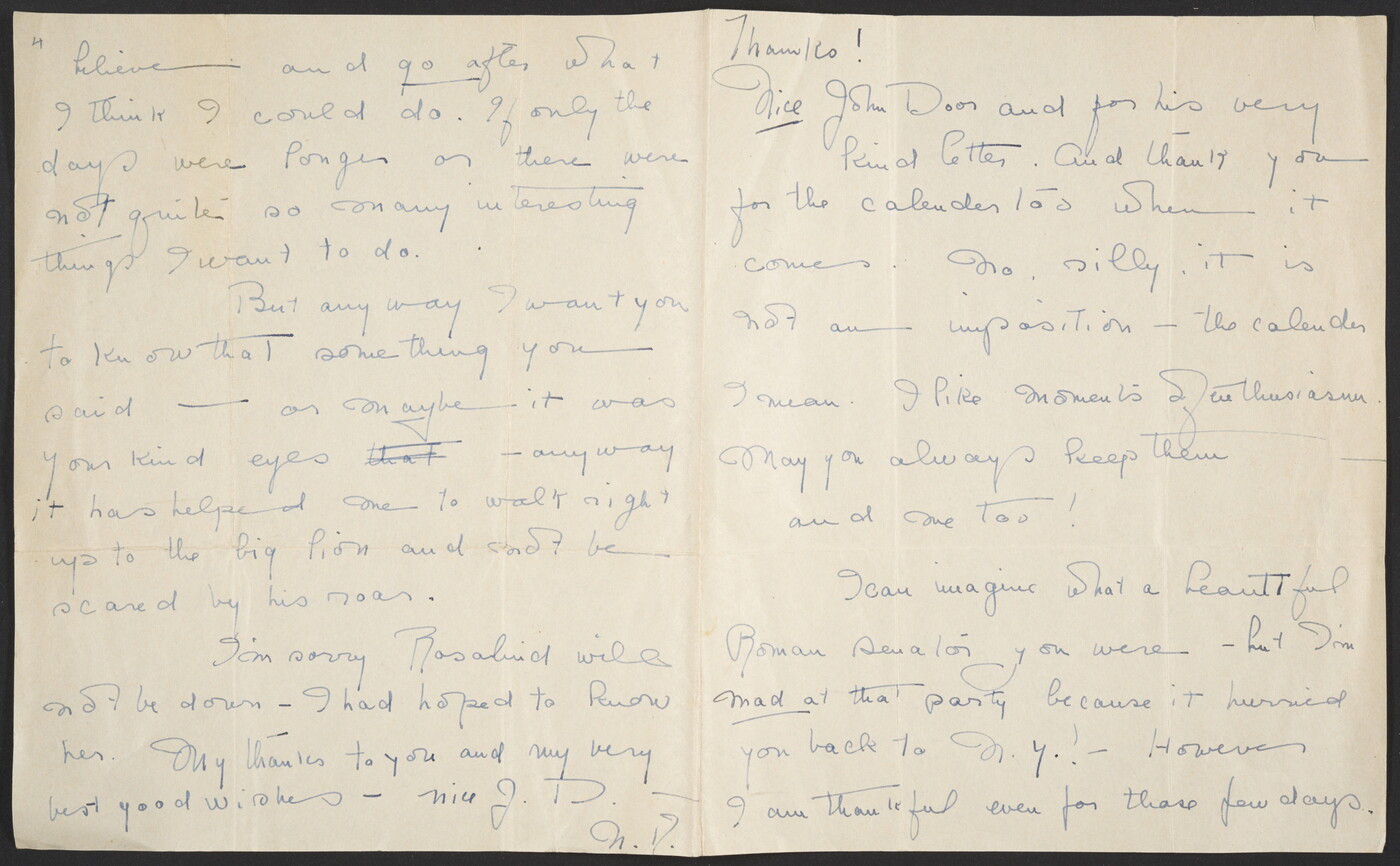 Autograph letter signed. Tells him that she is glad he liked the picture. Says Kit is off duck hunting in the Keys and Nell fears she will have to “nurse a broken something.” Virginia is working on the children’s pages for “The Gondolier” of which she is the junior editor, and Betty is giving Barbara dancing lessons. Says she appreciates his encouragement which led her to get an advertising account.