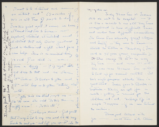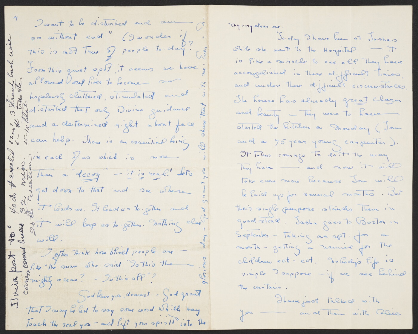Autograph letter signed. Reports being at Tasha’s [Tudor] house while Tasha goes to the hospital to be with her husband Tom who will be laid up now for several months. Asks him to try to get free from work to go to Mackinac to give them both inspiration for their problems and for “just living.” Quotes Rilke to him, saying, “This it is we must do, ‘learn to close over what is infinite.’” Says peoples’ lives are so cluttered, stimulated, and disturbed that only Divine guidance can help. [There is a nearly illegible note along the margin in different ink and different handwriting that is about posts, barbed wire, and corner cement braces.]