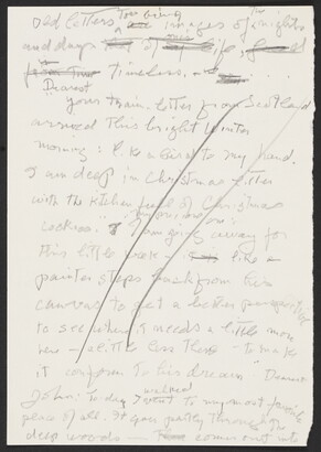 Autograph letter signed. Says she got his letter from Scotland this morning and that she is surrounded by Christmas litter and cookies, and tells that she is taking a little break for a while to get a new perspective. Tells him that she went to her favorite place - a sunny field with blackberries and pines - where she takes off her shoes and stockings and lies down and revels in the beauty there. (This page of a letter was in a folded paper that says on the outside: “Enclosed are parts of letters in Nell’s handwriting. The first pages are missing so the name of the recipient is lost. However, they are signed the way Nell wrote to John, and they were in a package of letters Nell wrote to him.”)