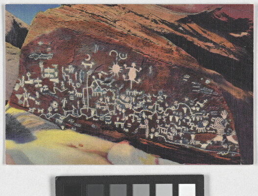u.l. printed: P.F.42 --- "NEWSPAPER ROCK," \ PETRIFIED FOREST, ARIZ. \ Halfway between the Painted Desert and \ the Petrified Forest, near Adamana, one of \ the finest specimen of ancient writings (picto- \ graphs) to be found in America. these writ- \ ings are the expressions of an unknown \ primitive people of long, long ago. Signs \ along the highway will direct you to them.