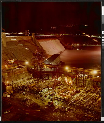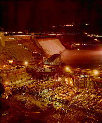 [Night construction activity at the Third Powerplant, Forebay Dam--Looking across spillway of Grand Coulee Dam]