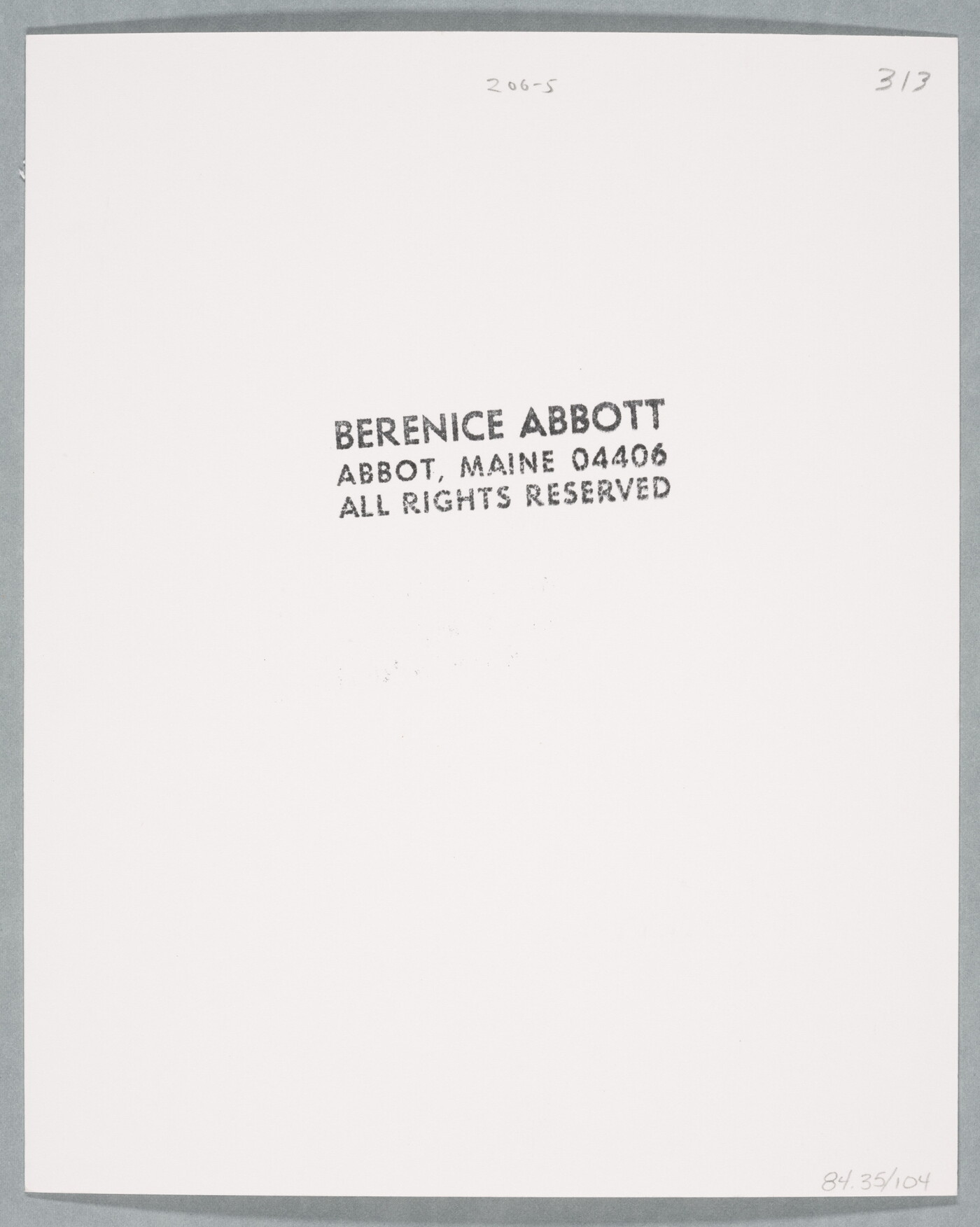 c. [stamp]: BERENICE ABBOTT \ ABBOT MAINE 04406 \ ALL RIGHTS RESERVED