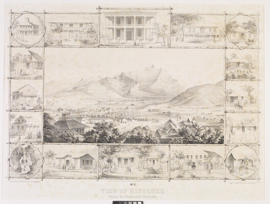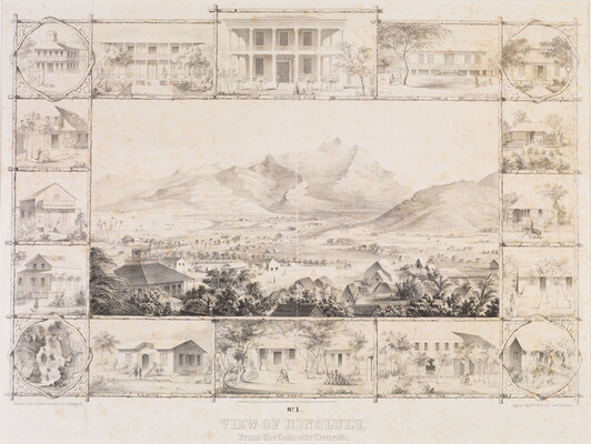 l.c.: Entered according to Act of Congress in the year 1854 by P. Emmert in the Clerks Office of the District Court of the Northern District of California. \ N[o]. 1. \ VIEW OF HONOLULU, \ From the Catholic Church.