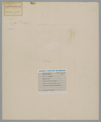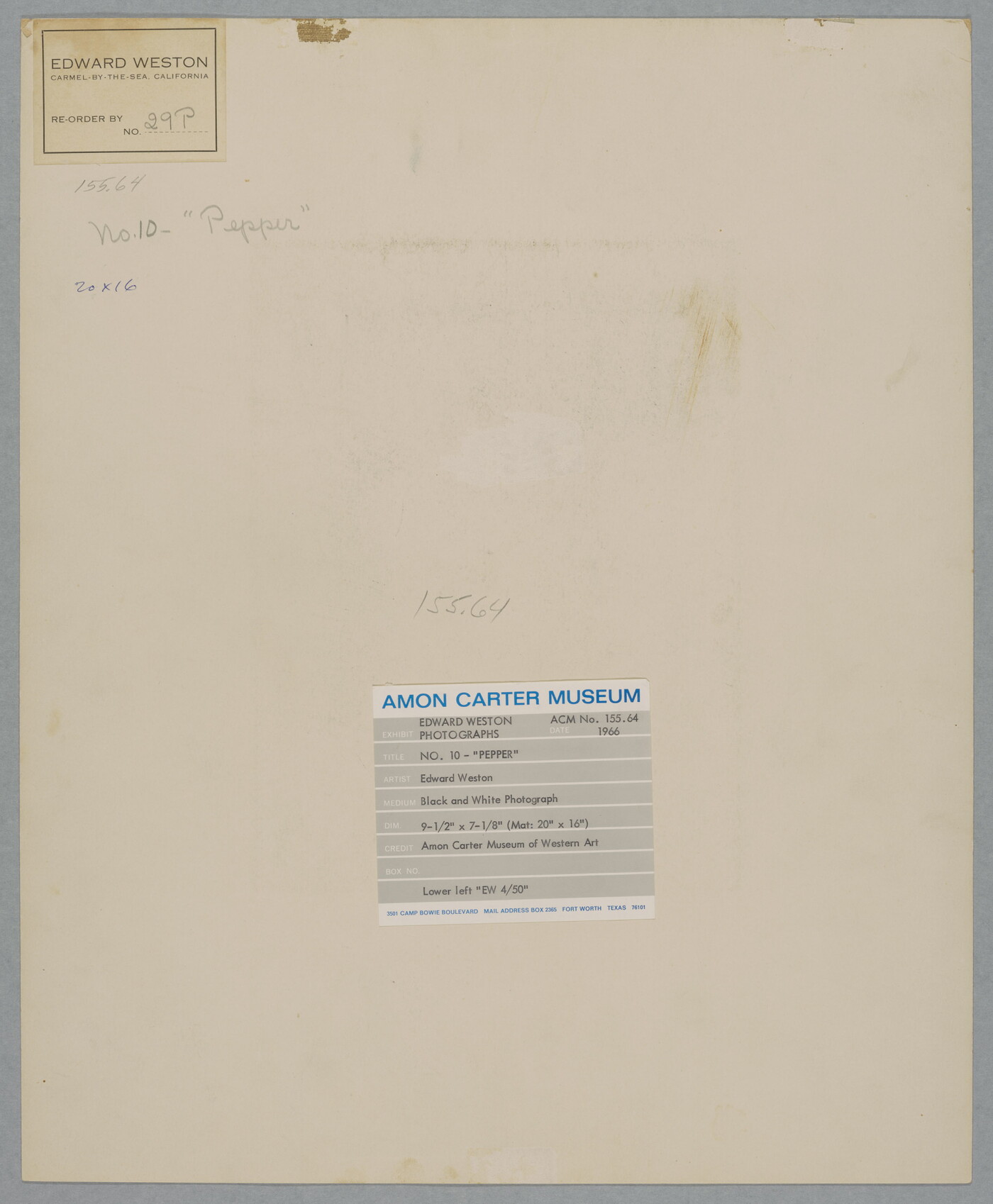 printed paper label: EDWARD WESTON \ CARMEL-BY-THE-SEA, CALIFORNIA \ RE-ORDER BY/NO. [in graphite] 29P