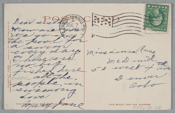 c. to l.r. in ink: Miss Laura Anne \ Mc Daniel \ 50 west 4 ave \ Denver \ Colo
