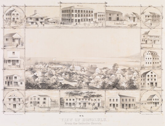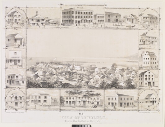 l.c.: Enter[d]. accord[g]. to act of Congress in the year 1854, by Pual [sic] Emmert in the Clerks Office of the District Court of the Northern District of Cal[a]. \ N[o]. 4. \ VIEW OF HONOLULU. \ From the Catholic Church.