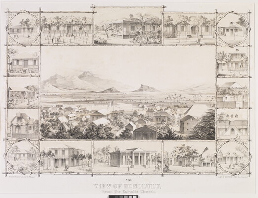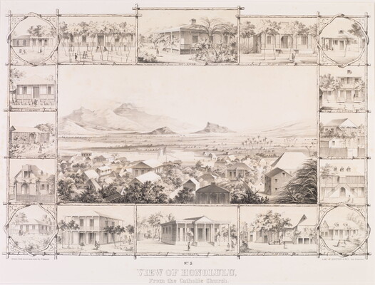 l.c.: Entered according to Act of Congress in the year 1854 by P. Emmert in the Clerk's Office of the District Court of the northern District of California. \ N[o]. 5. \ VIEW OF HONOLULU, \ From the Catholic Church.