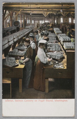 l.l. to l.r. printed in red, below image: Interior, Salmon Cannery on Puget Sound, Washington.