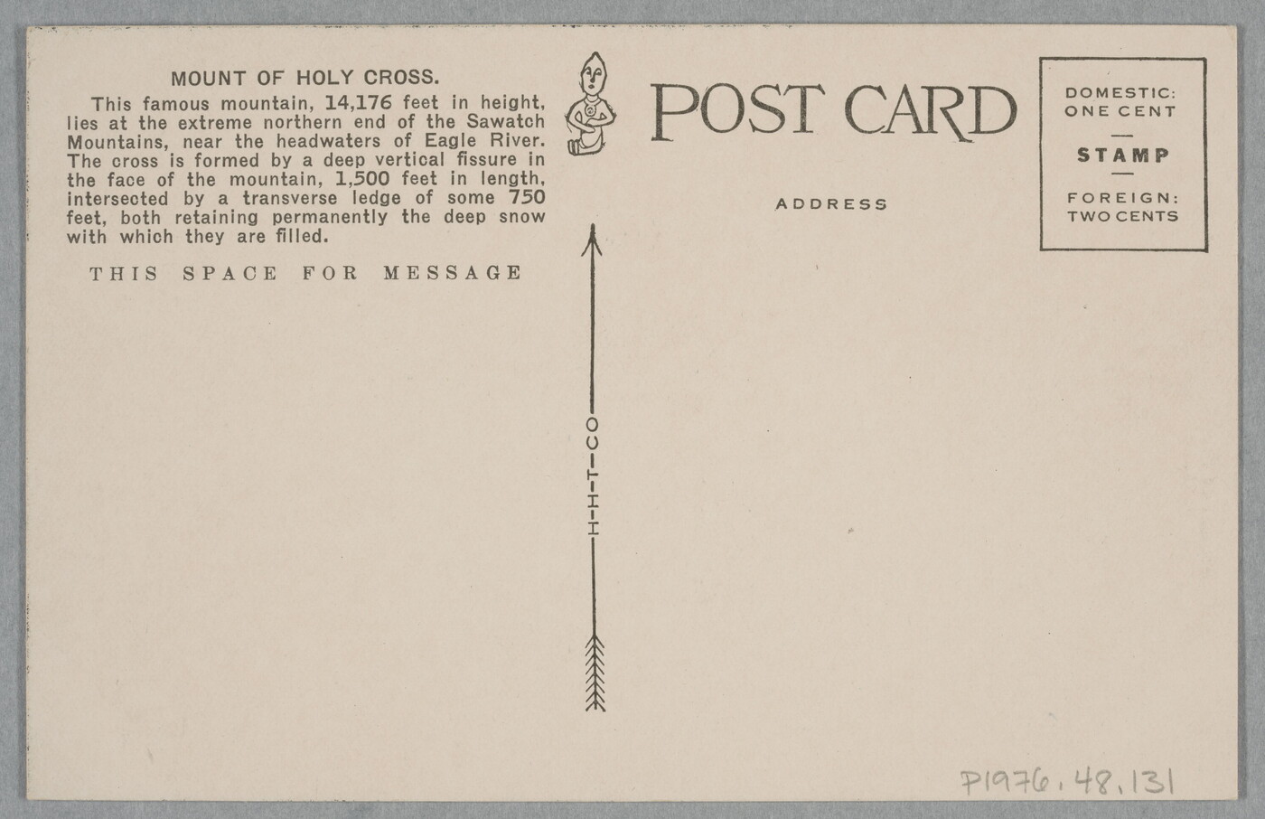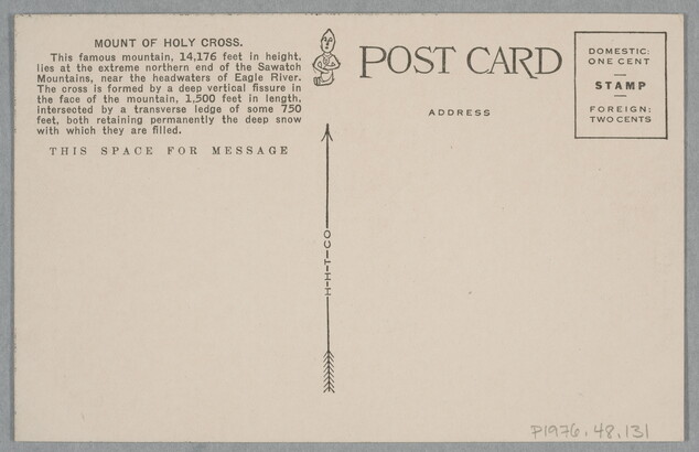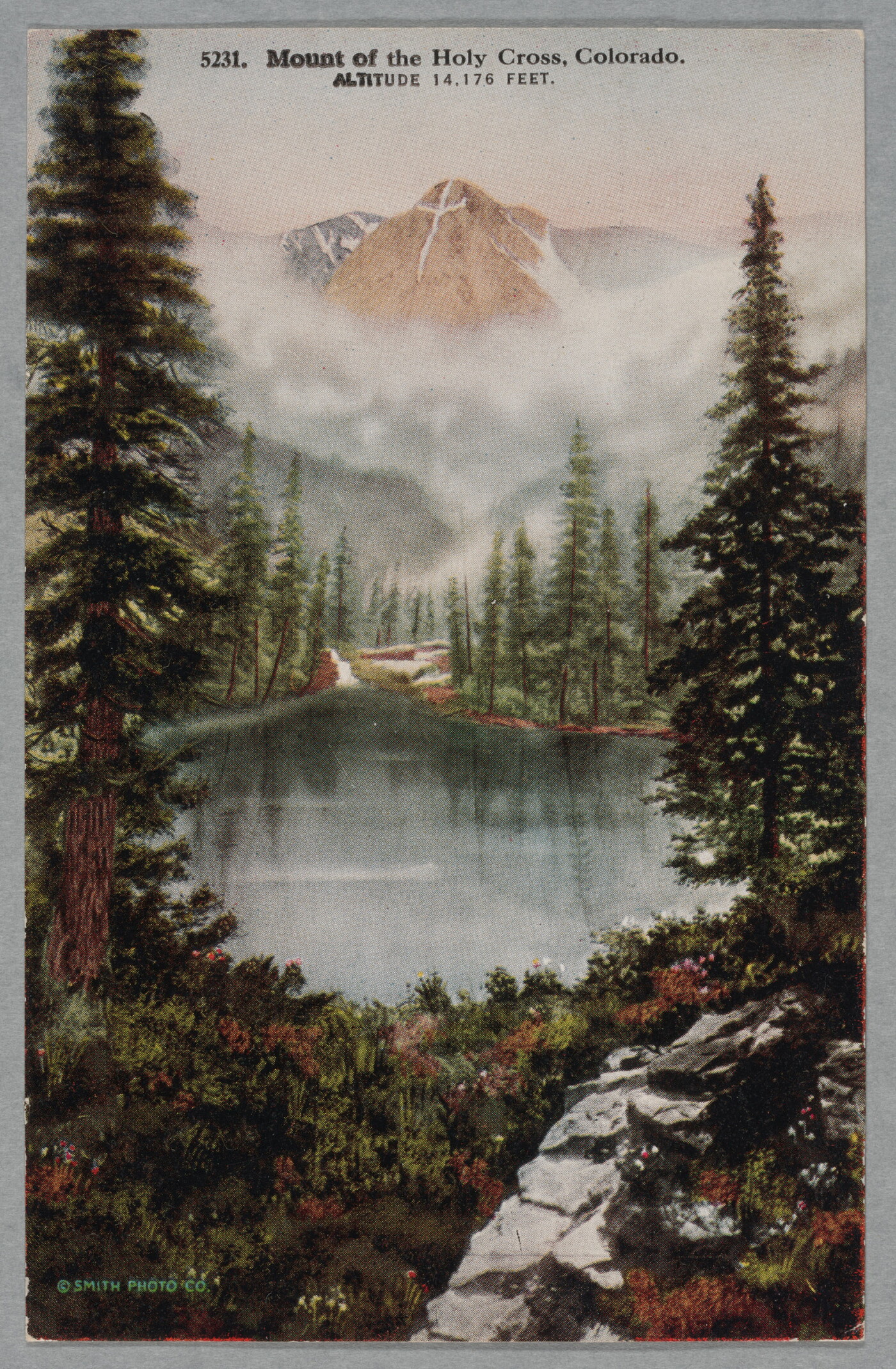 Inscriptions recto: u.c. printed in black: 5231. Mount of the Holy Cross, Colorado \ ALTITUDE 14.176 FEET. l.l. printed in green: © SMITH PHOTO CO. Verso [vertical]: u.l. printed: MOUNT OF HOLY CROSS. \ This famous mountain, 14,176 feet in height, \ lies at the extreme northern end of the Sawatch \ Mountains, near the headwaters of Eagle River. \ The cross is formed by a deep vertical fissure in \ the face of the mountain, 1,500 feet in length, \ intersected by a transverse ledge of some 750 \ feet, both retaining permanently the deep snow \ with which they are filled. c. printed [transverse]: H-H-T-CO