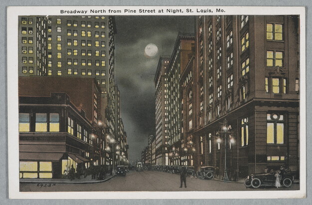 u.l. to u.r. printed in black, above image: Broadway North from Pine Street at Night, St. Louis, MO.
