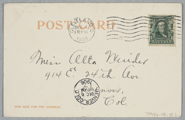 c. in ink: Miss Alta Winder \ 914 E. 24th Ave. \ Denver, \ Col.