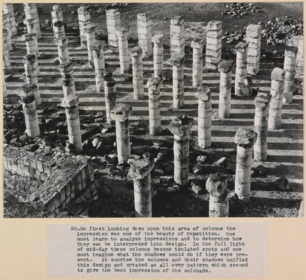 l.c. typed on paper label: 20. On first looking down upon this area of columns the \ impression was one of the beauty of repetition. One \ must learn to analyze impressions and to determine how \ they can be interpreted into design. In the full light \ of mid-day these columns become isolated spots and one \ must imagine what the shadows could do if they were pre- \ sent. At sunrise the columns and their shadows unified \ this design and created an all over pattern which seemed \ to give the best impression of the colonade [sic].