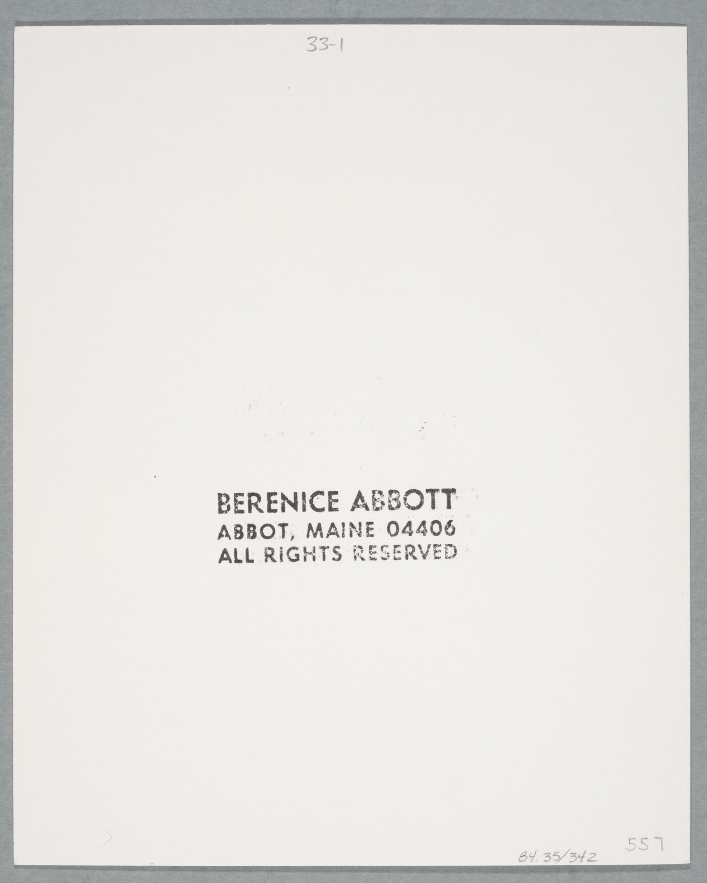 c. [stamp]: BERENICE ABBOTT \ ABBOT, MAINE 04406 \ ALL RIGHTS RESERVED