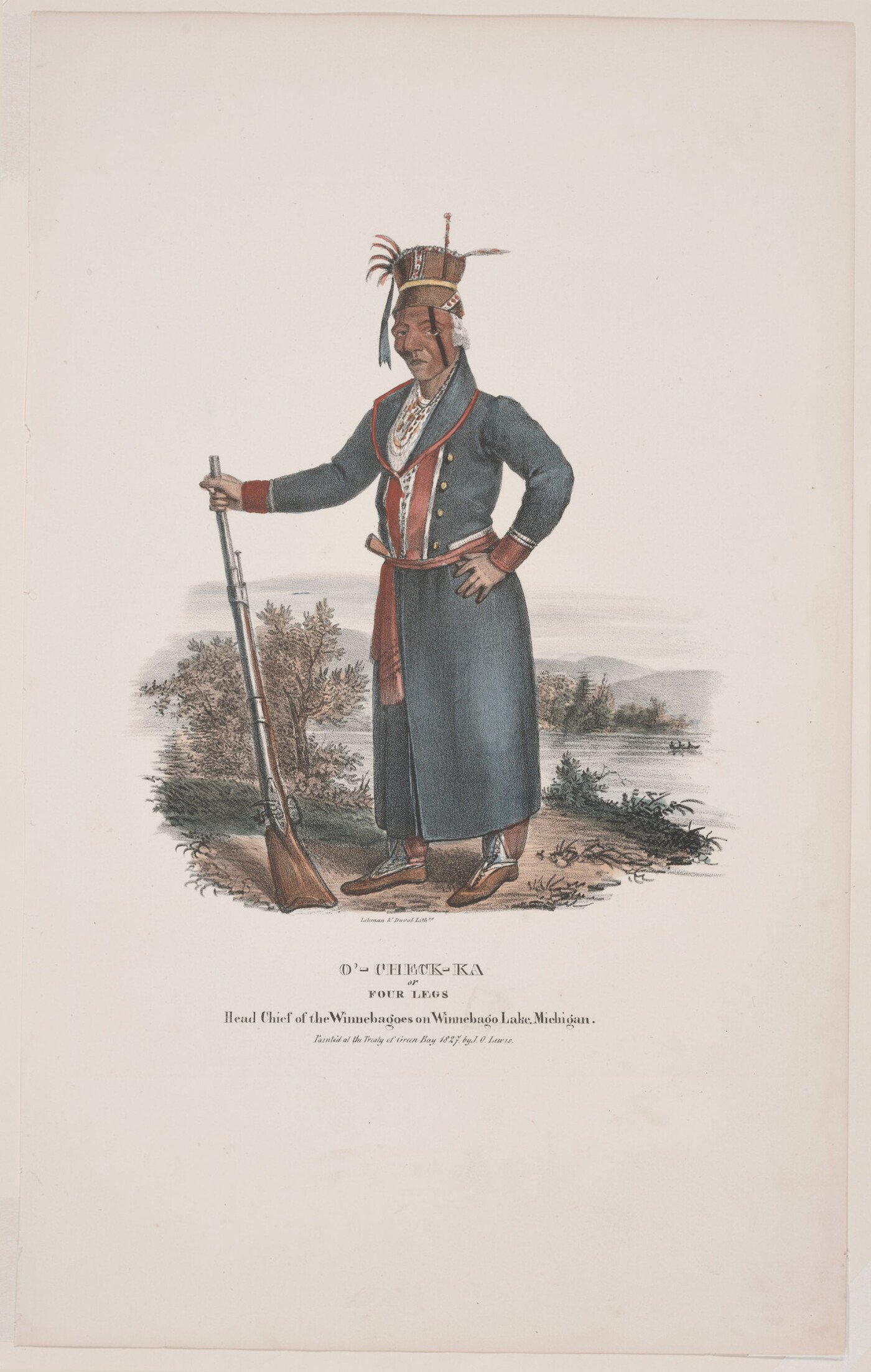 l.c.: Lehman & Duval Lith[rs]. \ O'-CHECK-KA \ or \ FOUR LEGS \ Head Chief of the Winnebagoes on Winnebago Lake. Michigan. \ Painted at the Treaty of Green Bay 1827. by J.O. Lewis.