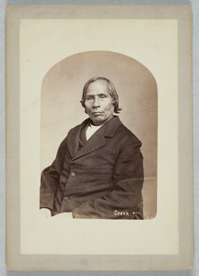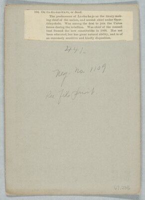 u.c. printed on paper label: 104. OK-TA-HA-SAS-HAJO, or Sand. \ The predecessor of Lo-cha-ha-jo as the treaty-mak- \ ing chief of the nation, and second chief under Opor- \ thleyoholo. Was among the first to joing the Union \ forces during the rebellion. Was chief of the council \ that framed the new constitution in 1866. Has not \ been educated, but has great natural ability, and is of \ an extremely sensitive and kindly disposition.