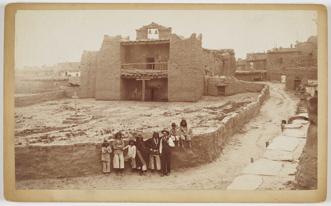 c. printed: Views in \ New Mexico, Arizona and Old Mexico \ Photoraphed by Wittick & Son. \ Ancient Ruins of the Caves and Cliff Dwellers, the Pueblos, Grand Canon of \ the Colorado, Walapai Indians, Supias, Apaches, Navajos, Mojaves \ Curiosities, etc., etc. Views along the Atlantic & Pacific \ Railroad in Arizona. Views of the Petrified \ Forest of Arizona. \ Published by \ Wittick & Son, \ Albuquerque, N.M. \ No. [in ink] Old Church, Zuni Pueblo, New Mex.