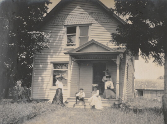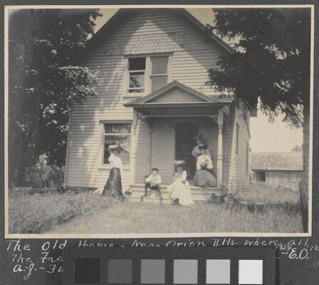l.l. to l.r. in ink: The Old Home - Near Orion Ills. - Where all \ the Freeman Children were born 1854 1857 - H.L. - E.O. \ A.J. - FW - Gussie - John - Eva - \ June 24th 1904.