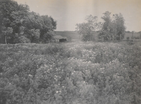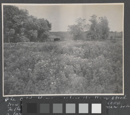 l.l. to l.r. in ink: The Old Home- Where the Barn Stood \ Now a field of Mayweed Blossoms \ To the Left. Trees Planted by H.L. Freeman when \ a boy June 24th 1904.