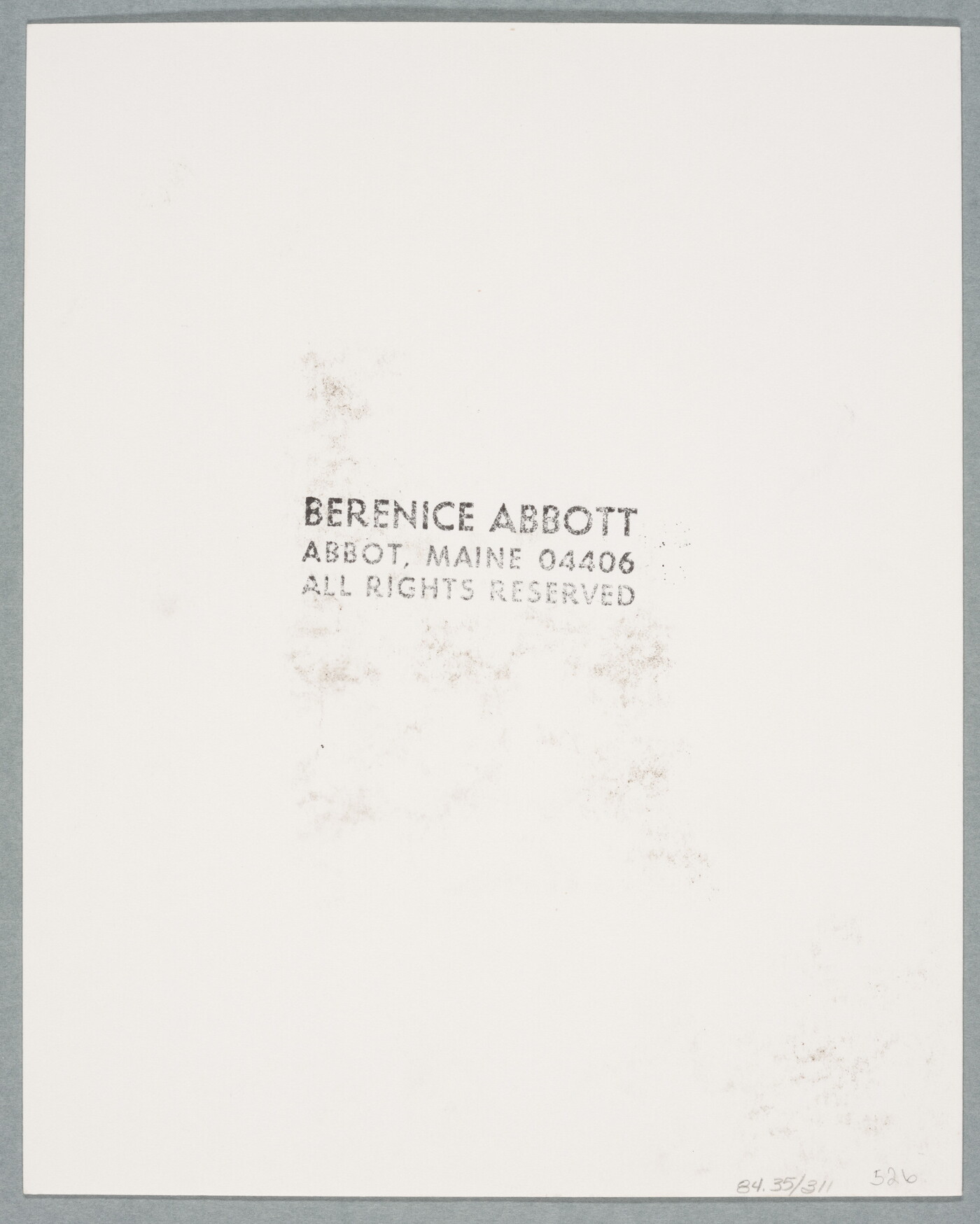 c. [stamp]: BERENICE ABBOTT \ ABBOT, MAINE 04406 \ ALL RIGHTS RESERVED