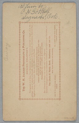 c. printed [horizontal]: THE W.H. JACKSON PHOTOGRAPH & PUBLISHING CO. \ DENVER, COLORADO. \ [see photograph of Verso for text]