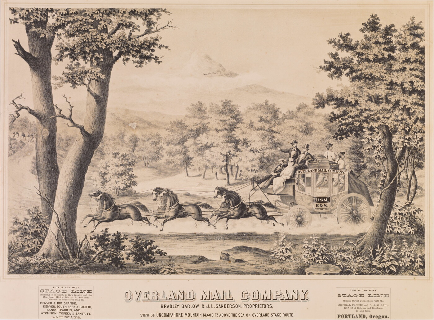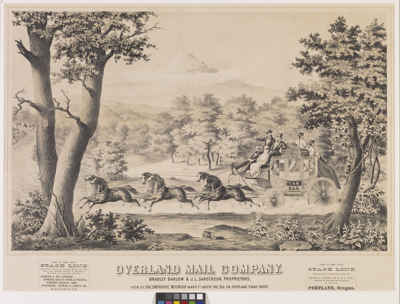 l.c.: OVERLAND MAIL COMPANY \ BRADLEY BARLOW & J.L. SANDERSON, PROPRIETORS \ VIEW OF UNCOMPAHGRE MOUNTAIN 14,400 FT. ABOVE THE SEA ON OVERLAND STAGE ROUTE
