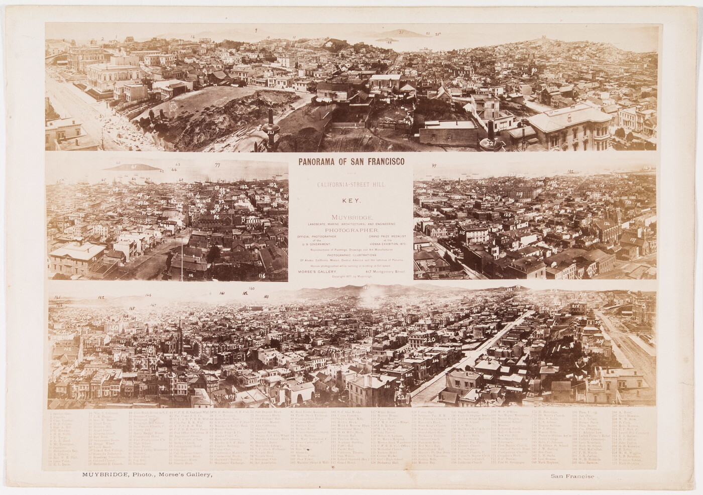 c. printed: PANORAMA OF SAN FRANCISCO \ FROM \ CALIFORNIA-STREET HILL \ KEY. \ MUYBRIDGE, \ LANDSCAPE, MARINE, ARCHITECTURAL AND ENGINEERING \ PHOTOGRAPHER. \ OFFICIAL PHOTOGRAPHER \ of the \ U.S. GOVERNMENT. \ GRAND PRIZE MEDALIST \ at the \ VIENNA EXHIBITION , 1873 \ Reproductions of Paintings , Drawings and Art Manufactures. \ PHOTOGRAPHIC ILLUSTRATIONS \ Of Alaska , California, Mexico, Central America, and the Isthmus of Panorama. \ Horses photographed while running or trotting at full speed. \ MORSE'S GALLERY. \ 417 MONTGOMERY STREET. \ Copyright 1877 BY Muybridge.
