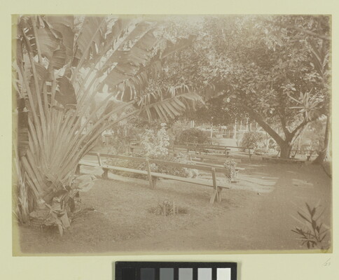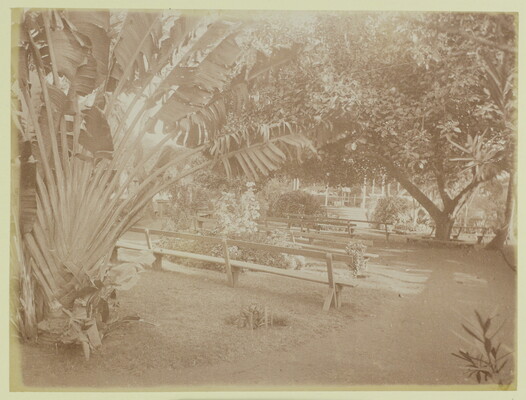 [Park with lush greenery and wooden benches]