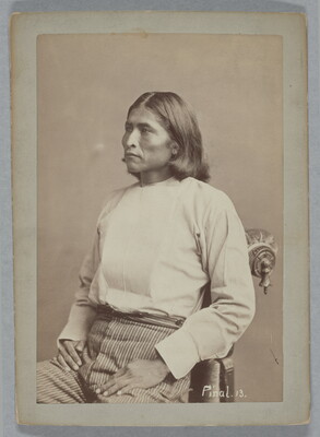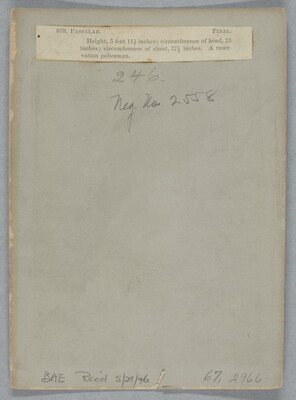 u.l. to u.r. printed on paper: 870. PASSALAH. PINAL. \ Height, 5 feet 11 1/2 inches; circumference of head, 23 \ inches; circumference of chest, 37 1/2 inches. A reser- \ vation policeman.