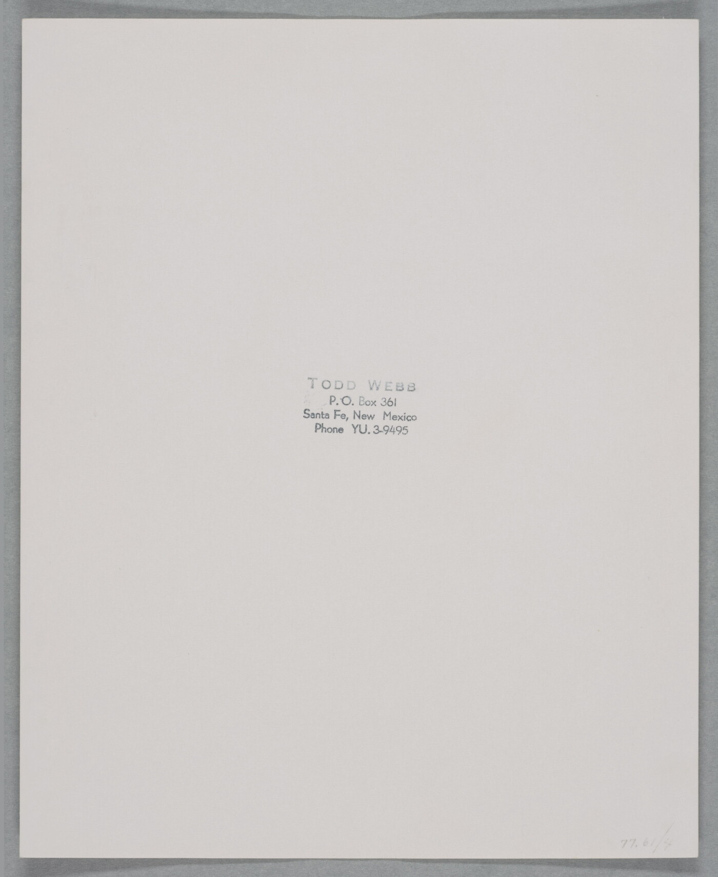 c. [stamp]: TODD WEBB \ P. O. Box 361 \ Santa Fe, New Mexico \ Phone YU.3-9495