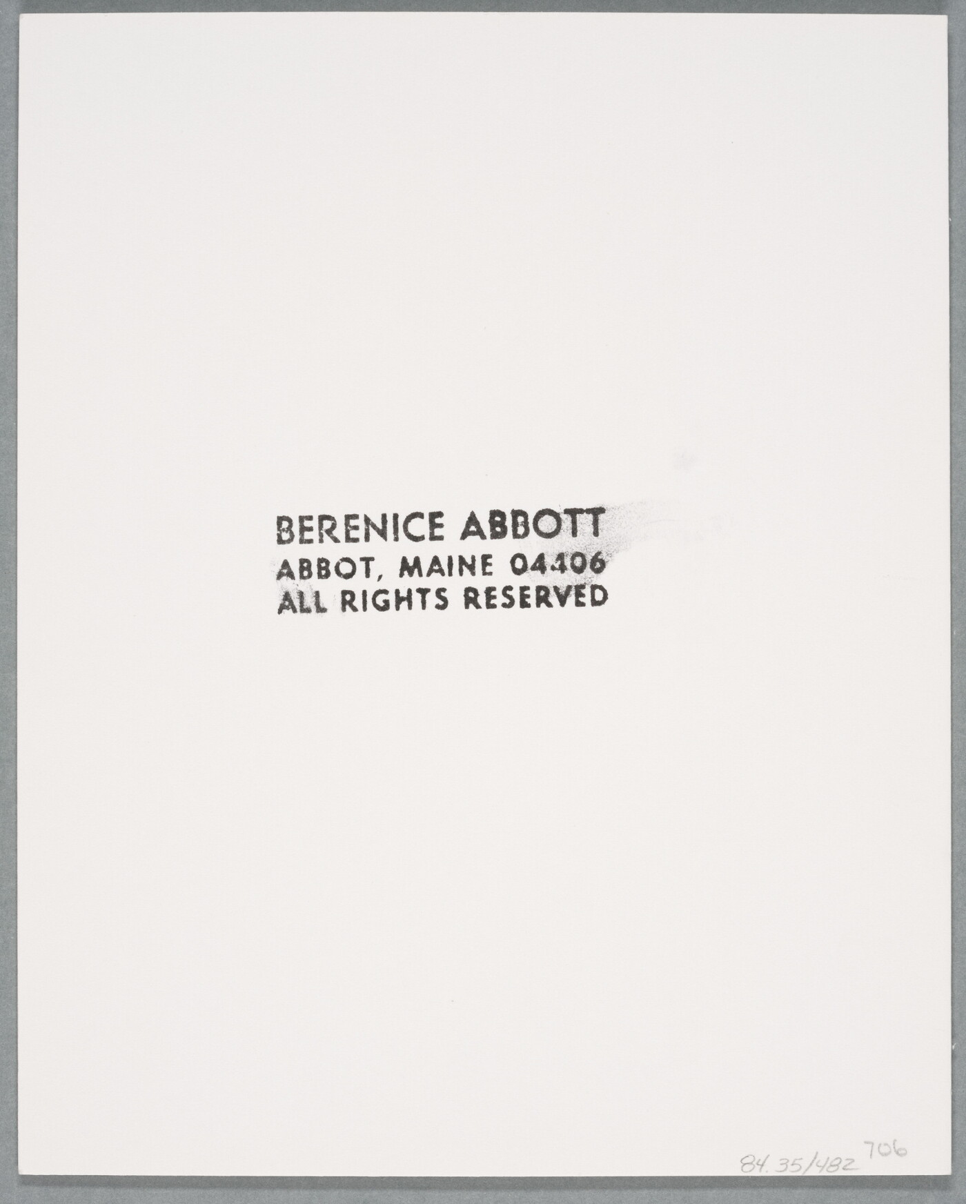 c. [stamp]: BERENICE ABBOTT \ ABBOT, MAINE 04406 \ ALL RIGHTS RESERVED
