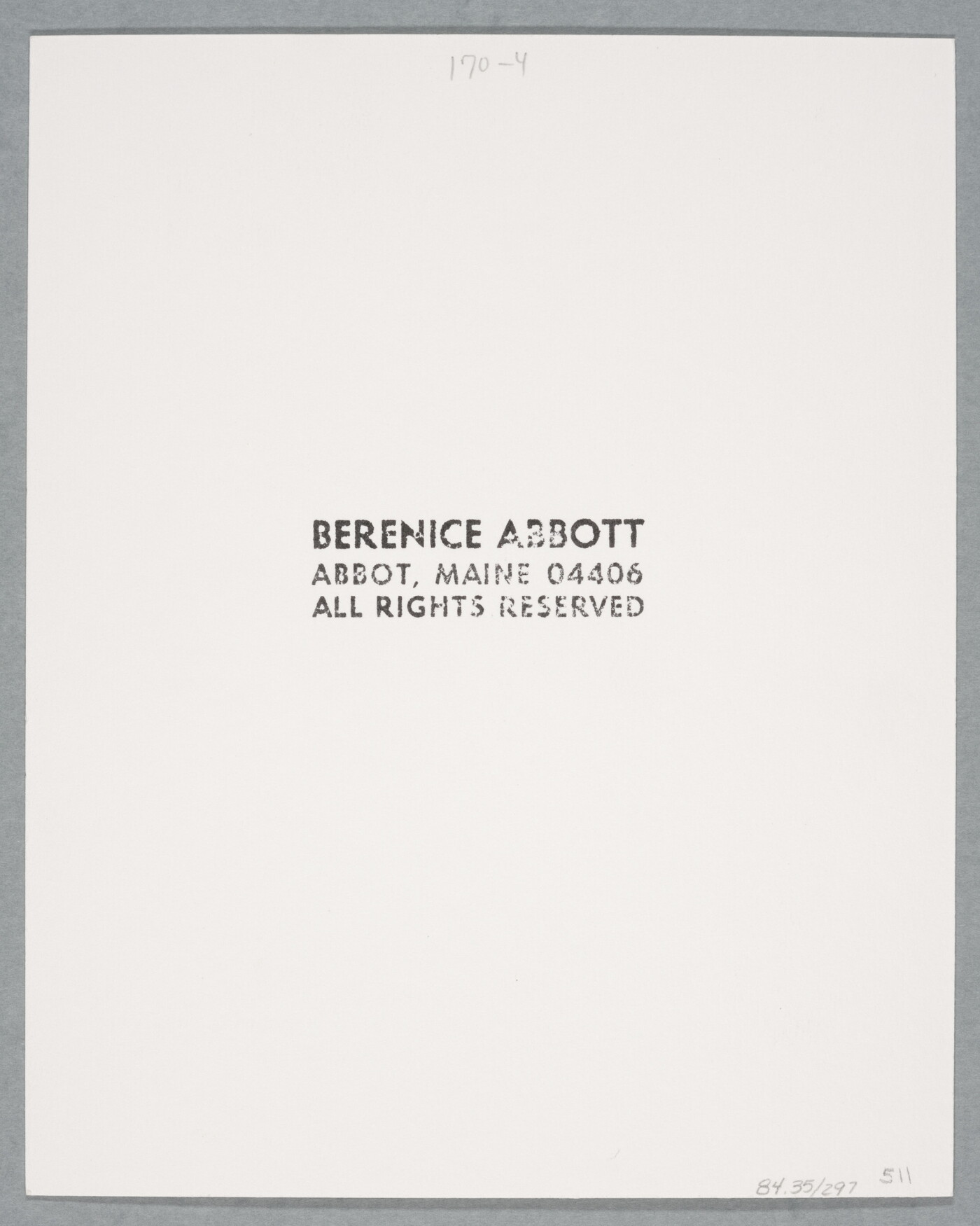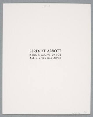 c. [stamp]: BERENICE ABBOTT \ ABBOT, MAINE 04406 \ ALL RIGHTS RESERVED