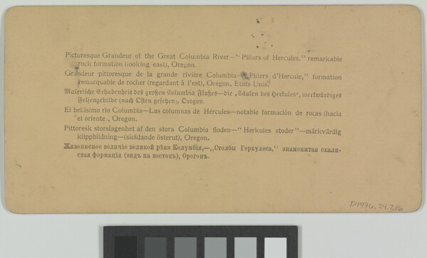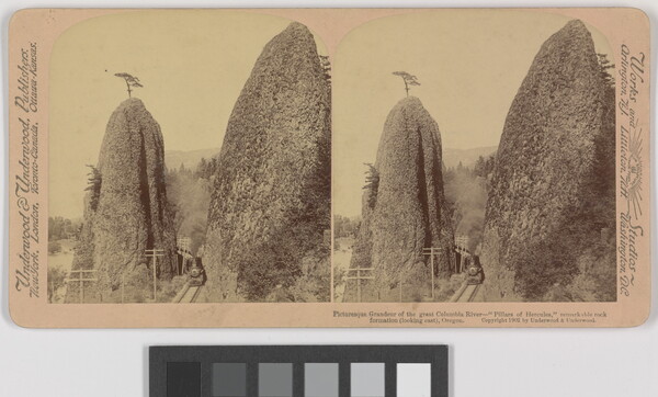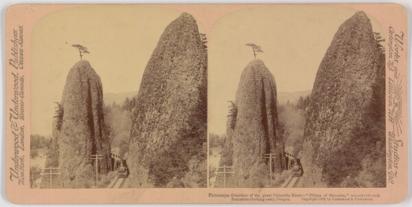 l.c. to l.r. printed: Picturesque Gradeur of the great Colombia River---"Pillars of Hercules" remarkable rock \ formation (looking east), Oregon. Copyright 1902 by Underwood & Underwood.