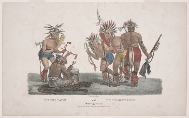 The Pipe Dance and the Tomahawk Dance of the Chippewa Tribe, Painted at the Treaty of Prairie du Chien, 1825