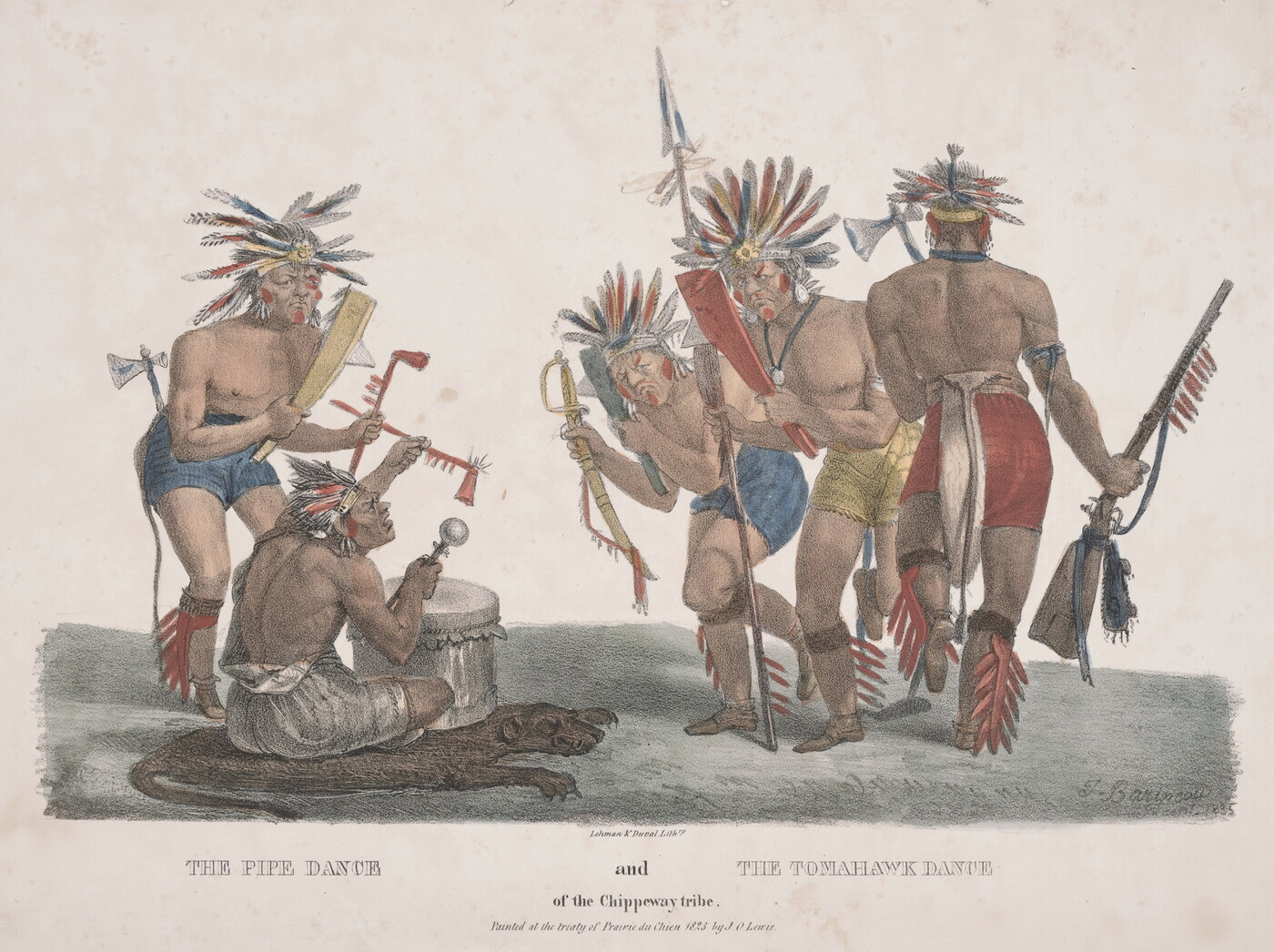 l.c.: Lehman & Duval Lith[rs]. \ THE PIPE DANCE and THE TOMAHAWK DANCE \ of the Chippeway tribe. \ Painted at the treaty of Prairie du Chien 1825 by J.O. Lewis.