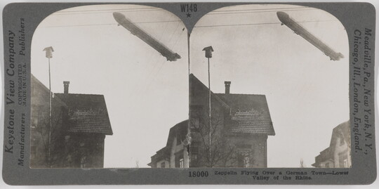 Zeppelin Flying Over a German Town - Lower Valley of the Rhine., ca. 1914-1918