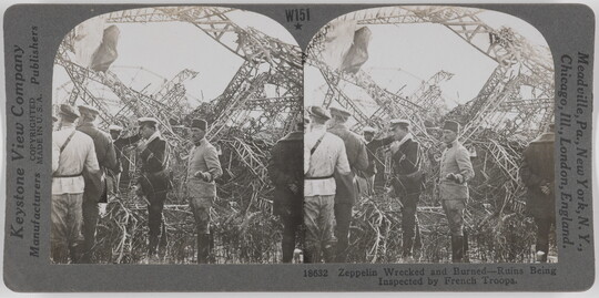 Zeppelin Wrecked and Burned - Ruins Being Inspected by French Troops., ca. 1914-1918