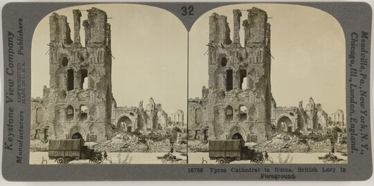 Ypres Cathedral in Ruins, British Lorry in Foreground., ca. 1914-1918