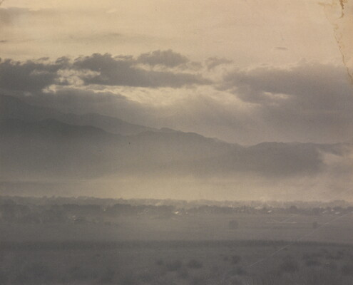[Plain and cloud-covered mountains]