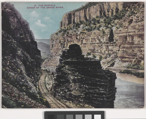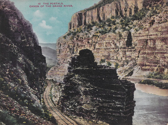 u.l. printed: This doorway into the mountains rises over 700 feet \ sheer from the raging stream that plunges out of the \ Canon. The railway at your feet is cut through the solid \ granite. Of the hundreds of wonderful scenes on The \ Denver & Rio Grande Railway, from Denver to Salt Lake \ City, none surpass the one here presented for grandeur \ and beauty.