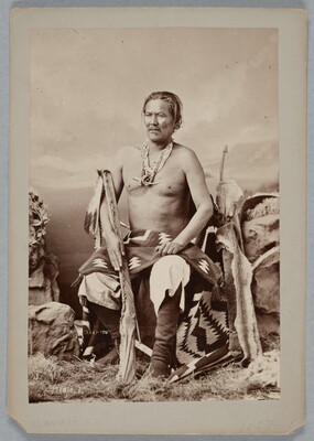 Portrait of Manuelito, War Chief, in Native Dress with Blankets, Ornaments, Black Skin and Feather Gun Case, Animal Skin Quiver, and Bow